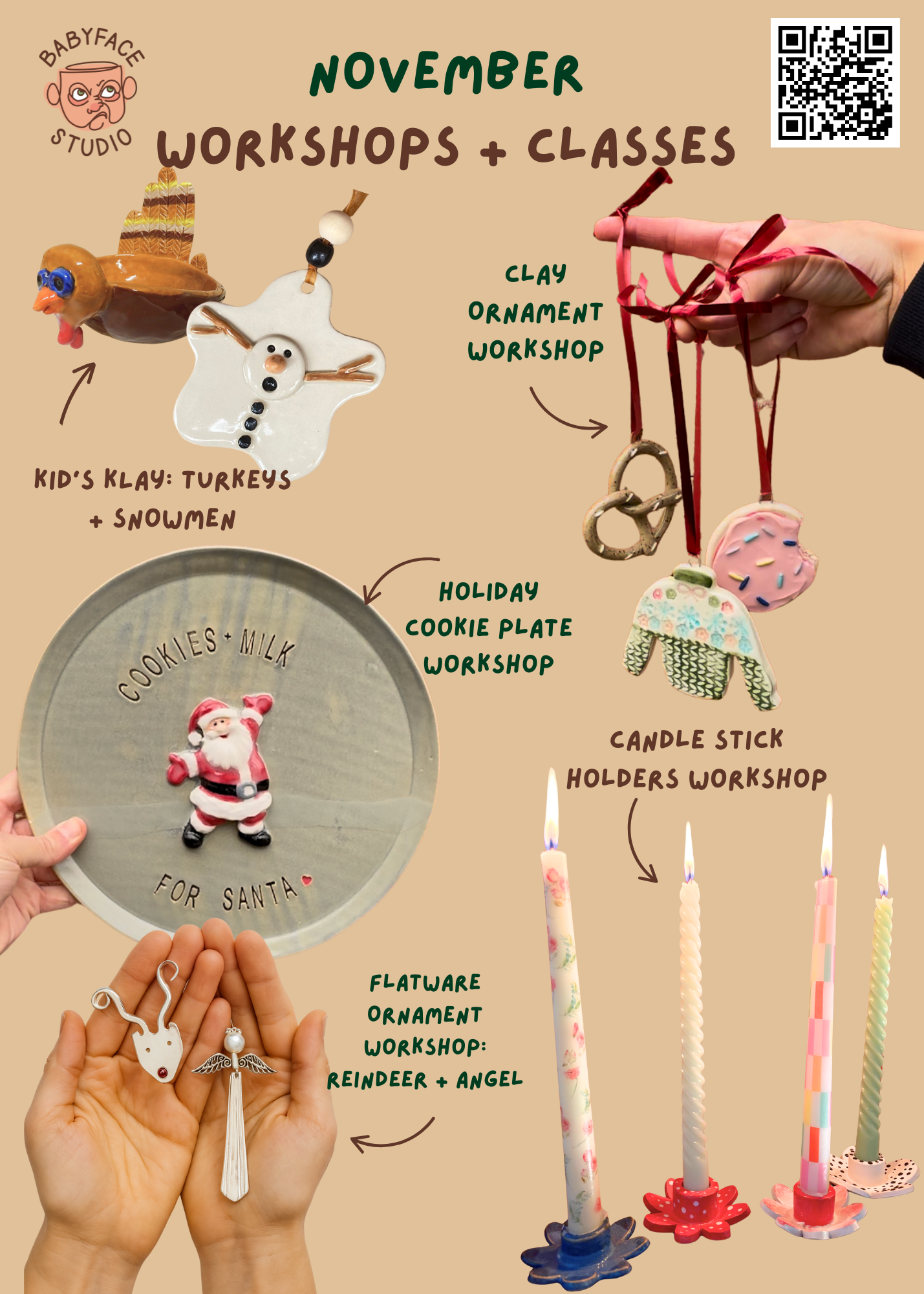 This project is pure fall fun! Kids will learn to hand-build their own piece, choose a glaze, and explore sculpting techniques that build tactile skills and hand-eye coordination. A great way to get into clay (and into the holiday spirit)!